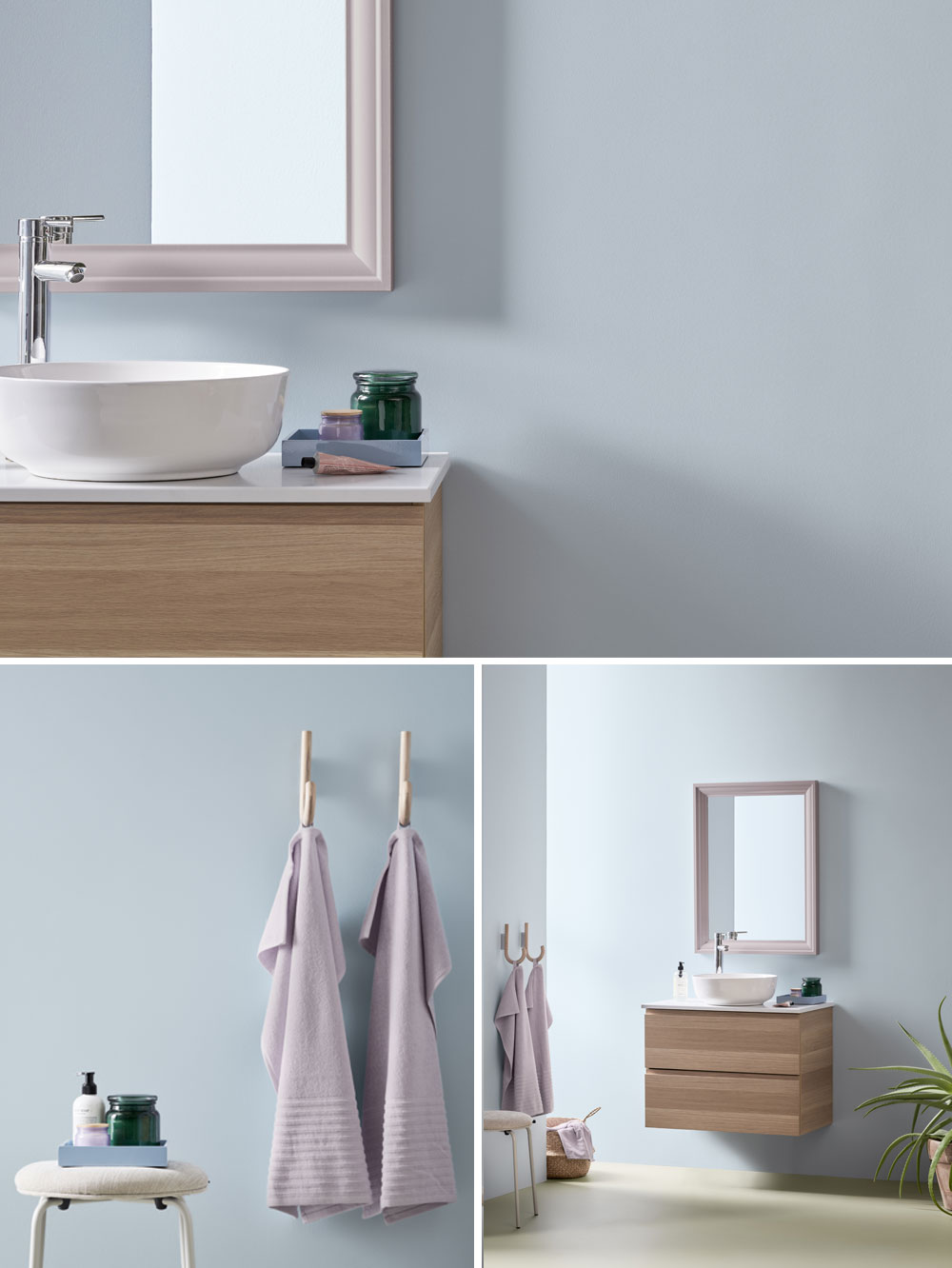 For at opnå den helt rette stemning i rummet, er det vigtigt at forholde sig til materialer og farver. Materialerne i rummet kan være af naturmaterialer, så som træ, sten og ler, tilsat smukke grønne planter. Farverne i rummet skal være lette og luftige, og her kommer kølige afdæmpede pastelfarver til sin ret. Brug f.eks. en farve som den kølige lyseblå Childhood Memory på væggene og brug andre lette farver til at male de mindre ting i rummet, som kanten på spejlet, der her er malet med den lyse lavendelfarve Petal Whisper.