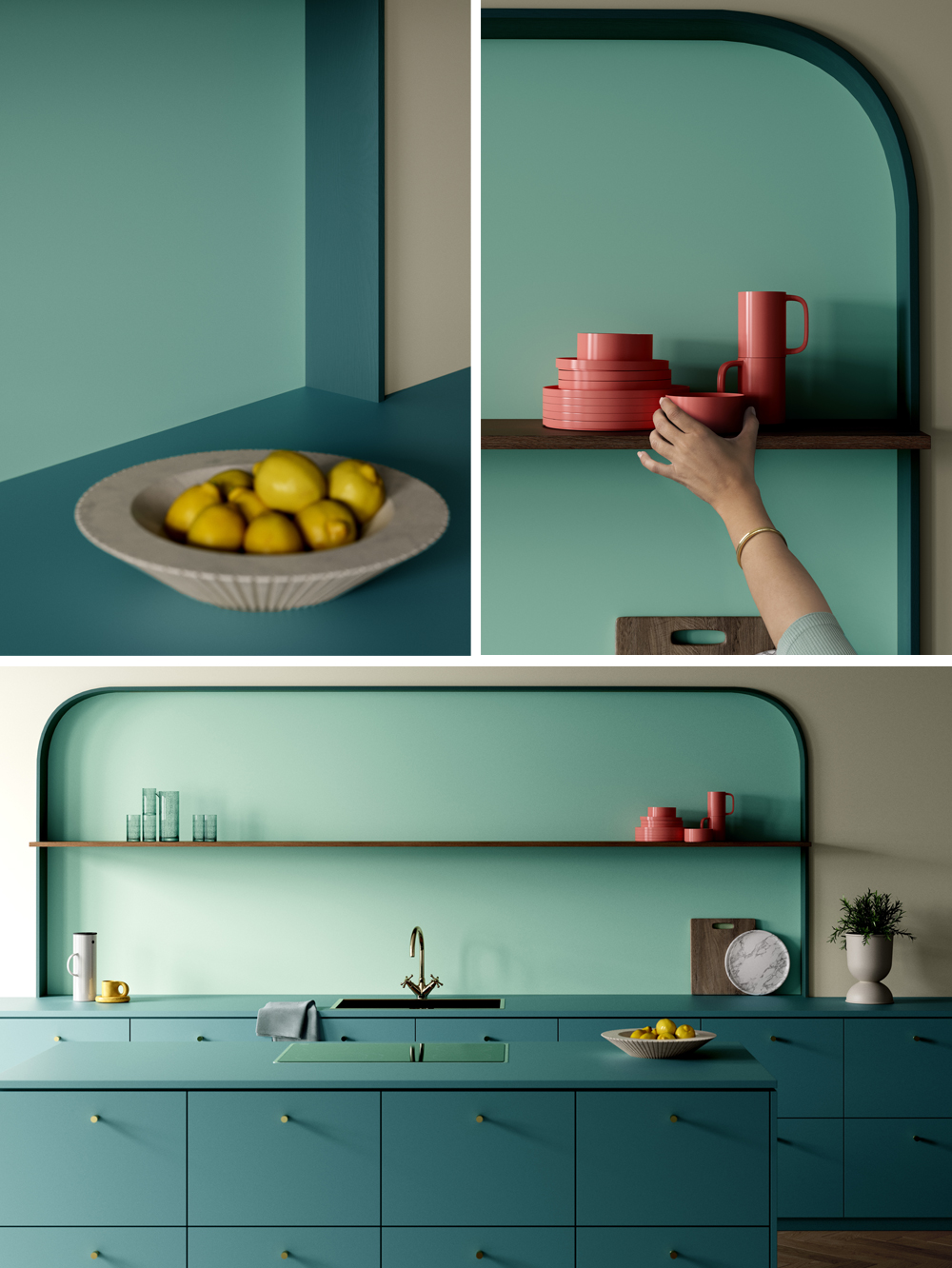 Kig mod amerikanske diners for inspiration til farvesætningen af køkkenet. En sammensætning af turkis farver sammensat med tilbehør i friske farver sat sammen med mørke træsorter er perfekt til denne stil. Vi har brugt den lyse turkis farve Tarreyton kombineret med set lyse grå Rabbit’s Ear på væggen. På låger og detaljer har vi brugt den lidt mørkere farve Vining Ivy.