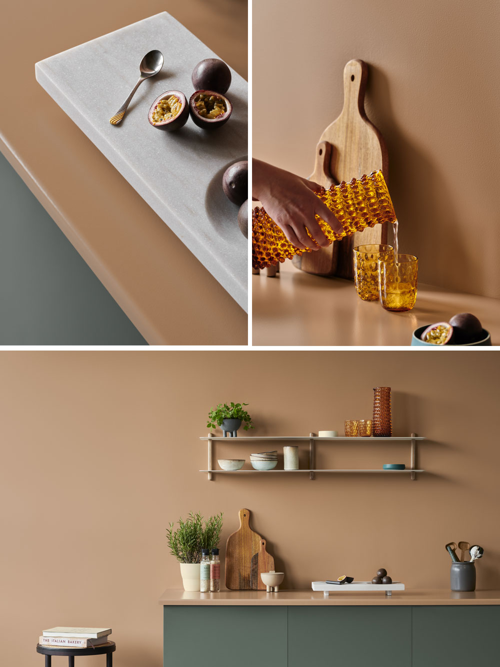 En anden trendretning vi ser er en nyfortolkning af retrotendensen, der historisk kan synes lidt mørk. Nu er der kommet fokus på de lyse farver i retropaletten og de mørke farver dukker op som detaljer, der underbygger den varme hyggelige stemning. I denne indretningsstil kigger vi tilbage i tiden for at finde tryghed i det som var engang, og vi går op i kvaliteten i de ting vi omgiver os med. Den råhvide Candlelit Beige og den støvede lyse lilla Mulberry Milk bliver fremtrædende farver på de store overflader, mens de mørkere farver Vining Ivy, Ancient Past og Yorkshire Moor giver dybde med de varme træsorter.