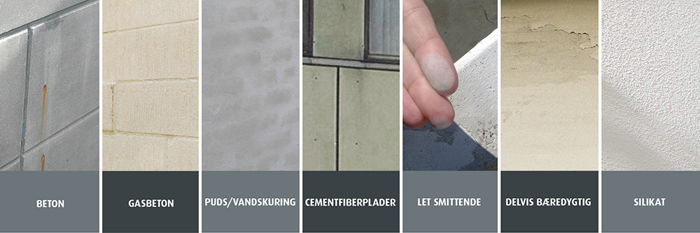 Med et stort sortiment finder du facademaling, der kan hæfte på mange forskellige materialer, heriblandt puds, beton, vandskuring, kalksandsten, PVC, zink, galvaniseret jern og træ.